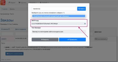 Примечание: Рекламодателю необходимо выбрать подходящий для описания мероприятия код категорий товаров и услуг (ККТУ), который будет автоматически передан в единый реестр интернет-рекламы для маркировки рекламы. Обычно для рекламы на сайте www.ticketland.ru используется код 5.2.5., он уже установлен в поле ККТУ, его можно оставить или заменить на другой из раскрывающегося списка.